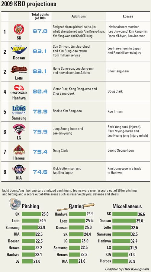 The JoonAng Ilbo baseball reporters’ predictions for the 2009 season don’t reveal any drastic changes from last year.